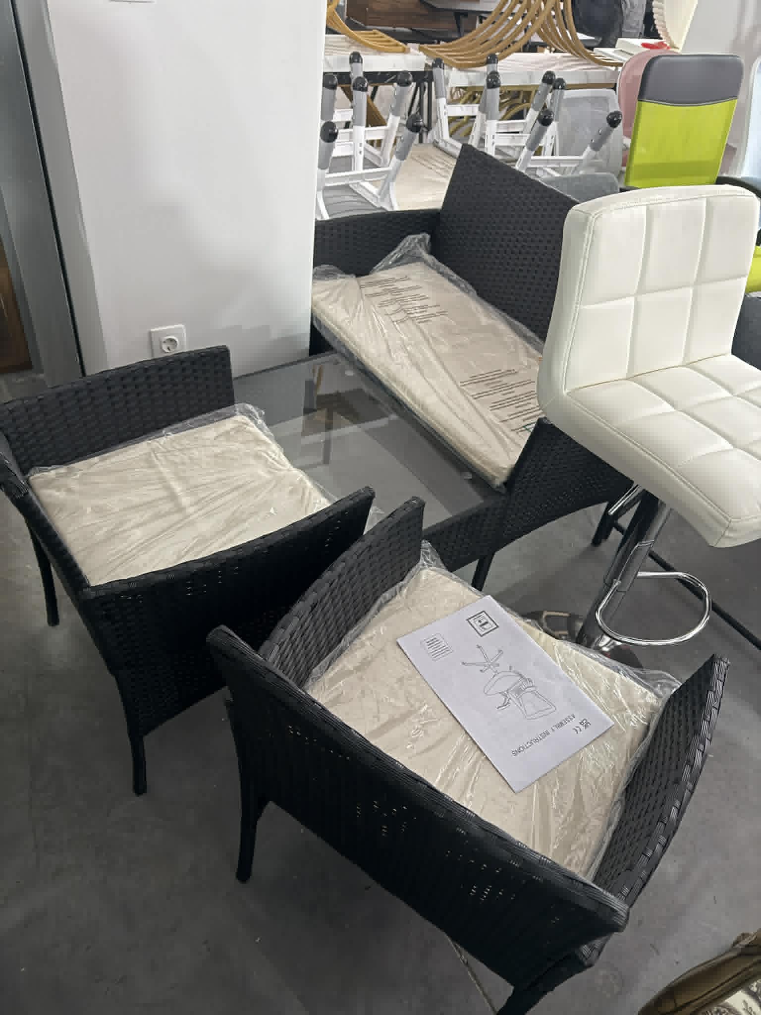 Brand new 4-piece outdoor polyrattan patio furniture set. Modern design with comfortable water-resistant cushions, perfect for terrace, balcony, or garden use.